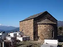 L'église isolée, au milieu d'un cimetière, est pourvue d'une ancienne arca[Note 8].