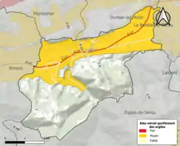 Les mouvements de terrains susceptibles de se produire sur la commune sont soit des chutes de blocs, soit des glissements de terrains, soit des effondrements liés à des cavités souterraines, soit des mouvements liés au retrait-gonflement des argiles. Près de 50 % de la superficie du département est concernée par l'aléa retrait-gonflement des argiles, dont la commune de Castelnau-Durban[39]. L'inventaire national des cavités souterraines permet par ailleurs de localiser celles situées sur la commune[40].