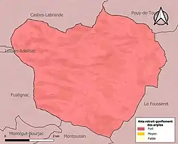 Le retrait-gonflement des sols argileux est susceptible d'engendrer des dommages importants aux bâtiments en cas d’alternance de périodes de sécheresse et de pluie. La totalité de la commune est en aléa moyen ou fort (88,8 % au niveau départemental et 48,5 % au niveau national). Sur les 120 bâtiments dénombrés sur la commune en 2019, 120 sont en aléa moyen ou fort, soit 100 %, à comparer aux 98 % au niveau départemental et 54 % au niveau national. Une cartographie de l'exposition du territoire national au retrait gonflement des sols argileux est disponible sur le site du BRGM[25],[Carte 3].