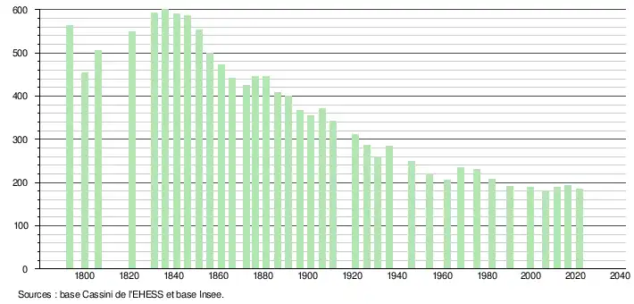 | L'évolution du nombre d'habitants est connue à travers les recensements de la population effectués dans la commune depuis 1793. Pour les communes de moins de 10 000 habitants, une enquête de recensement portant sur toute la population est réalisée tous les cinq ans, les populations légales des années intermédiaires étant quant à elles estimées par interpolation ou extrapolation[22]. Pour la commune, le premier recensement exhaustif entrant dans le cadre du nouveau dispositif a été réalisé en 2006[23]. En 2021, la commune comptait 185 habitants[Note 2], en diminution de 4,64 % par rapport à 2015 (Landes : +4,9 %, France hors Mayotte : +1,84 %). |