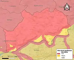 La commune est vulnérable au risque de mouvements de terrains constitué principalement du retrait-gonflement des sols argileux[26]. Cet aléa est susceptible d'engendrer des dommages importants aux bâtiments en cas d’alternance de périodes de sécheresse et de pluie. La totalité de la commune est en aléa moyen ou fort (76,3 % au niveau départemental et 48,5 % au niveau national). Sur les 653 bâtiments dénombrés sur la commune en 2019, 653 sont en aléa moyen ou fort, soit 100 %, à comparer aux 90 % au niveau départemental et 54 % au niveau national. Une cartographie de l'exposition du territoire national au retrait gonflement des sols argileux est disponible sur le site du BRGM[27],[Carte 3].
