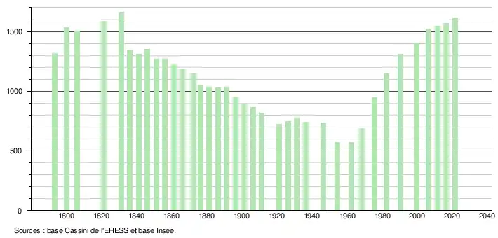 | L'évolution du nombre d'habitants est connue à travers les recensements de la population effectués dans la commune depuis 1793. Pour les communes de moins de 10 000 habitants, une enquête de recensement portant sur toute la population est réalisée tous les cinq ans, les populations légales des années intermédiaires étant quant à elles estimées par interpolation ou extrapolation[34]. Pour la commune, le premier recensement exhaustif entrant dans le cadre du nouveau dispositif a été réalisé en 2006[35]. En 2021, la commune comptait 1 617 habitants[Note 8], en augmentation de 3,19 % par rapport à 2015 (Tarn : +1,82 %, France hors Mayotte : +1,84 %). |
