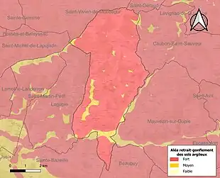 Le retrait-gonflement des sols argileux est susceptible d'engendrer des dommages importants aux bâtiments en cas d’alternance de périodes de sécheresse et de pluie[23]. La totalité de la commune est en aléa moyen ou fort (91,8 % au niveau départemental et 48,5 % au niveau national)[Carte 2]. Depuis le , en application de la loi ELAN, différentes contraintes s'imposent aux vendeurs, maîtres d'ouvrages ou constructeurs de biens situés dans une zone classée en aléa moyen ou fort[Note 3],[24].