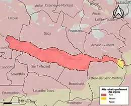 Le retrait-gonflement des sols argileux est susceptible d'engendrer des dommages importants aux bâtiments en cas d’alternance de périodes de sécheresse et de pluie. La totalité de la commune est en aléa moyen ou fort (88,8 % au niveau départemental et 48,5 % au niveau national). Sur les 178 bâtiments dénombrés sur la commune en 2019, 178 sont en aléa moyen ou fort, soit 100 %, à comparer aux 98 % au niveau départemental et 54 % au niveau national. Une cartographie de l'exposition du territoire national au retrait gonflement des sols argileux est disponible sur le site du BRGM[37],[Carte 3].