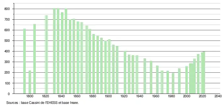 L'évolution du nombre d'habitants est connue à travers les recensements de la population effectués dans la commune depuis 1793. Pour les communes de moins de 10 000 habitants, une enquête de recensement portant sur toute la population est réalisée tous les cinq ans, les populations légales des années intermédiaires étant quant à elles estimées par interpolation ou extrapolation[42]. Pour la commune, le premier recensement exhaustif entrant dans le cadre du nouveau dispositif a été réalisé en 2004[43].