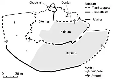 La plate-forme supérieure est limitée au nord par un à-pic rocheux de plusieurs dizaines de mètres de hauteur, au sud et à l'ouest par un mur défensif. Le logis seigneurial dont il ne reste que les fondations y prend place. Les opérations archéologiques ont révélé les vestiges de quelques-uns de ces bâtiments dont ceux du donjon. Une citerne creusée dans le rocher, à voûte de blocs de pierre, actuellement en grande partie comblée, en occupe la base. Une ouverture pratiquée en bordure de la voûte permettait d'y puiser de l'eau.