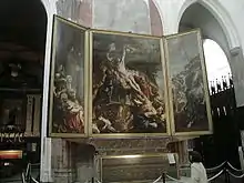 - Descente de la croix - du même Rubens, peinte en 1612 sur un panneau monumental de 4,21 m × 3,11 m, agrémentés de deux panneaux latéraux de 4,21 m × 1,53 m). C'est l'un des tableaux les plus célèbres du maître, commandé par la corporation des arquebusiers dont le patron est Saint Christophe.
