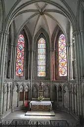 Le chevet dérive de celui de l'abbatiale Saint-Étienne de Caen. Les chapelles rayonnantes, à part la chapelle axiale, sont inscrites dans la construction. Le chœur de style gothique a été construit entre 1220 et 1240. Il présente les caractéristiques du gothique normand comme Saint-Étienne de Caen, Coutances et Sées. La partie supérieure des contreforts des arcs-boutants accueille des statues représentant la Vierge Marie, des évêques et des saints. Elles ont été remplacées au XIXe siècle par des copies[26].