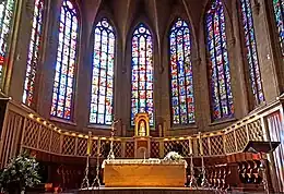 - Les grandes verrières du chœur créées par Louis Barillet de Paris.