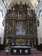 - Le maitre-autel est un spectaculaire chef-d’œuvre de style baroque primitif. Il occupe toute la hauteur du mur du chevet. L’architecture en bois à colonnes est haute de 20 mètres et large de 14 mètres : plusieurs sculpteurs sur bois furent mis à contribution. De nombreuses colonnes dorées divisent l’ensemble verticalement, créant des niches pour les saints et des tableaux. Des corniches le divisent horizontalement en quatre étages. Le deuxième étage, juste au-dessus de la table d’autel, est dominé par la peinture illustrant le 'baptême de Jésus au bord du Jourdain'. Tout l’ensemble est polychrome.