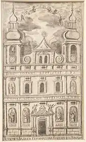 La façade principale est flanquée de deux tours carrées avec horloge. Elle est rythmée horizontalement par une triple corniche et verticalement par les pilastres entre lesquels se trouvent niches de saints et fenêtres. Sous les deuxième et première corniches, en travers de la façade et des tours, se lit la dédicace: 'DIVO IOANNI BAPTISTAE P.D.S. COMES NICOLAUS EZTERHAZI R.H. PAL.' (À saint Jean-Baptiste, le comte Nicolas Esterhazy, palatin du Royaume de Hongrie)