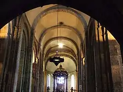 La nef principale est voûtée en berceau plein cintre, qui tend à devenir brisé vers l'ouest, attestant les différentes campagnes de construction de l'ancienne cathédrale et de leurs avancées en fonction de l'état des finances de l'évêché. La voûte est supportée par de lourds piliers cruciformes ornés de colonnes engagées. Les piliers sont légèrement penchés vers l'avant et la corniche monte en s'éloignant par-dessus les grandes arcades. Tout ceci fut réalisé par les architectes romans dans le but d'améliorer la perspective.