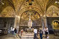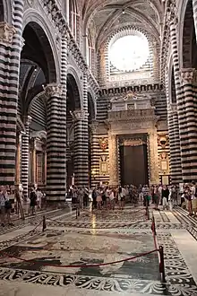 Elle est connue pour son pavement intérieur entièrement constitué de marqueteries de marbre figuratives, une création qui s'est étalée sur six siècles, faisant l'objet d'un article à part : Pavement intérieur du Duomo de Sienne.