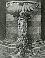 Son plan est octogonal. Quatre des huit colonnes aux angles reposent sur des lions portant des colonnes, tandis que la colonne centrale sur un socle octogonal est ornée de personnages figurant les arts libéraux et la philosophie. Les arcs sont en plein cintre, avec des trèfles et, au-dessus des chapiteaux, des figures en marbre représentant la Logique et les Vertus cardinales. Les rainures des arcades portent des prophètes et des évangélistes.