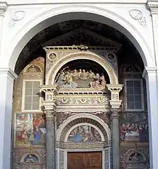 - Le porche (1522-26). Dans la lunette au-dessus de l’entrée, fresque de la Nativité ; à gauche, l’Annonciation ; à droite, la Présentation de Jésus au Temple. En haut, groupe en terre cuite représentant les apôtres et l’Assomption de Marie ;