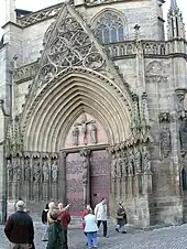Concomitamment avec la construction des Kavaten aux alentours de 1330, fut réalisée l’entrée principale de l’édifice, savoir la structure accotée au bras nord du transept, laquelle, s’avançant en hors-œuvre, fait porche et présente un portail à gâble. Un telle disposition est inhabituelle, car la façade représentative, avec portail, de la cathédrale ne se situe pas sur sa face occidentale, mais s’aperçoit lorsque l’on vient du nord-ouest. Cette disposition a été commandée principalement par l’espace limité qu’offre le Domhügel, qu’il fallait partager avec l’église Saint-Sévère voisine et avec l’importante cité médiévale à l’est de la cathédrale. Les sculptures qui ornent cette entrée figurent les douze apôtres et la parabole des dix vierges, dont Ecclésia et Synagogue.