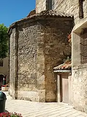 À l'est, face à la place du Cloître, la cathédrale présente un petit chevet à cinq pans dont les angles sont marqués par des contreforts qui soutiennent une corniche en pierre surmontée d'une toiture de tuiles rouges. La maçonnerie du chevet, hétéroclite, présente un mélange de pierre de taille et de moellons avec, par endroits, quelques briques. Elle est complètement aveugle, sauf une fenêtre rectangulaire au sud-est. À l'intérieur, cette abside originelle de petite taille a été condamnée[6].