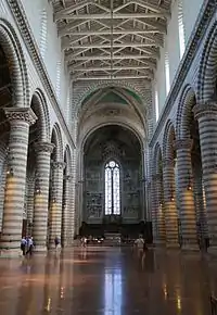 L’intérieur est de type basilical à trois nefs divisées par dix colonnes et deux pilastres de basalte noir et de travertin blanc, ornés de riches chapiteaux, dont certains réalisés par Fra Guglielmo de Pise et Ramo di Paganello. D’une longueur de 90 mètres et large de 33 mètres pour une hauteur de 34 mètres, la cathédrale mêle les formes romanes du dessin primitif et l’élancement ogival du chœur, le tout éclairé par douze ouvertures situées au-dessus des galeries par des grandes ouvertures absidiales. Le pavement, en calcaire rouge de Prodo, s’étend de l’entrée jusqu’à l’abside et donne une illusion de longueur plus importante qu’en réalité.