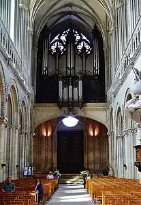 Vers 1245-1255 on assiste à la reprise des parties hautes de la nef, dans un parti-pris différent avec suppression du triforium au bénéfice de vastes baies. C'est la première réalisation du style rayonnant en Normandie. Enfin, le transept reçoit sa nouvelle charpente en 1226 pour le croisillon sud et 1250 au nord, mais le décor n'est réalisé que dans la seconde moitié du XIIIe siècle[9].