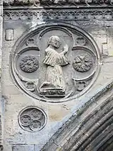 Un des contreforts, édifié au début du XIIe siècle pour renforcer la tour sud, est agrémenté d'une inscription funéraire, sans doute d'Isabelle de Douvres, sœur de l'évêque Richard de Douvres[23].