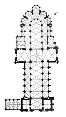 La nef était flanquée de bas-côtés surmontés de tribunes. Elle possédait également une tour-lanterne[4]. .