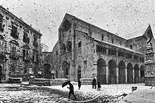 L'église actuelle est un édifice roman des XIe et XIIe siècles, influencé par la Basilique San Nicola de Bari. La façade ouest est divisée en trois parties et a trois portails (celui du centre est sculpté de motifs végétaux et de scènes de l'Ancien Testament), avec quatre fenêtres à meneaux et une rosace flanquée de sculptures d'animaux supportée par des petites colonnes.