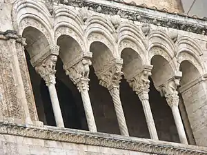 Sur la façade méridionale, de hautes arcades supportent une galerie de loggia à colonnettes ornées de chapiteaux. Sous la dernière arcade s'ouvre la Porte de l'excommunication, souvenir de la condamnation de Frédéric II par le pape Grégoire IX qui l'accusait de s'être compromis avec le sultan Al-Kâmil lors de la croisade de 1227.