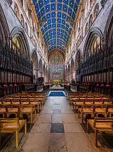 Cathédrale de Carlisle, vue du chœur en direction de l'autel. Juin 2014.