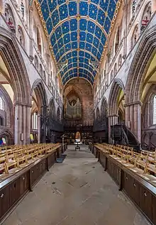 Cathédrale de Carlisle, vue de l'autel en direction du chœur et de l'orgue. Juin 2014.