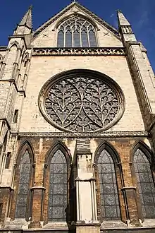 Les deux grandes rosaces, Dean’s Eye (l’œil du doyen) et Bishop’s Eye (l’œil de l’évêque), ont été ajoutées au Moyen Âge tardif. Dean’s Eye, au transept nord, date de 1235 et Bishop’s Eye, au transept sud, a été refait entre 1325 et 1350[17]. Un texte contemporain, "The metrical life of St. Hugh", relate la signification de ces vitraux :