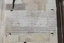 - Les deux plaques de fondations qui se trouvent sur le mur extérieur de l’abside principale et sur la façade ouest. (voir en détail plus loin).
