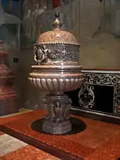 Dans la chapelle Bellincini sont placés de délicats fonts baptismaux en marbre rose.
