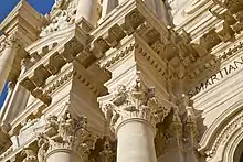 La façade présente deux ordres horizontaux séparés par un entablement à ressauts. La partie inférieure est formée de six colonnes hautes et robustes d'ordre corinthien, dont les quatre centrales soutiennent un fronton brisé crénelé et encadrent le portail central. Les deux colonnes latérales portent à leur extrémité les statues des deux martyrs de Syracuse, saint Marcian et sainte Lucie[4].