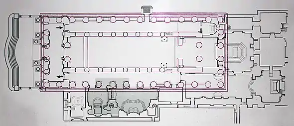 La façade, le campanile et le côté gauche avec les colonnes doriques.