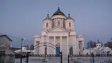 L'église principale est un haut édifice à cinq coupoles dans le style néoclassique. L'édifice est en briques recouvert de plâtre peint en blanc. La façade principale se présente avec un portique tétrastyle avec des portiques doriques latéraux tétrastyles. Les coupoles sont ornées de pilastres jumelés corinthiens pour la coupole principale à haut tambour et ioniques pour les quatre dômes de côté. Les fenêtres sont à plein cintre.