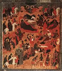 - Icône de la Nativité du Christ. Elle date de la seconde moitié du XVIe siècle. Le style de peinture est nordique. Doska en pin, pavoloka, levkas, tempera, 180 × 155 cm. Il s'agit de détails de la tradition donnée par les Évangiles sur la naissance du Christ en conservant même des détails mineurs. L'icône ne présente pas de centre pour sa composition, les scènes se relient librement les unes aux autres. Elle a été peinte par un maître de qualité de son époque, peut-être le meilleur de Kargopol, qui se distingue par une interprétation spontanée inhérente au folklore. Le ciel est représenté par un fragment en cercle en haut de l'icône. La description des évènements commence par le voyage de Joseph et Marie à Bethléem. Marie est représentée sur un cheval blanc, accompagnée par Joseph et un jeune homme qui mène la monture. Au centre de l'icône est représentée la naissance du Christ. La Vierge est allongée sur un drap rouge. L'enfant Jésus vêtu de blanc est couché dans sa crèche. Il est entouré d'anges. Dans les coins supérieurs les rois mages sont représentés galopant sur des chevaux. En bas à droite, un ange informe les bergers de la naissance du Sauveur. Encore plus bas deux femmes lavent l'enfant Jésus. Des bergers glorifient l'enfant emmailloté en musique. À gauche les trois mages apportent des cadeaux. À gauche Joseph est assis et parle avec un vieil homme.