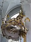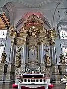 La cathédrale a un autel de 13 mètres de haut, un confessionnal, une chaire, au deuxième étage se trouve la loge des ducs de Courlande. La cathédrale se distingue particulièrement par son orgue à 131 jeux, 4 claviers et plus de 7 000 tuyaux, ce qui en fait le plus grand orgue mécanique du monde jusqu'en 19681968[2]. C'était le premier grand orgue mécanique en Lettonie et il a été fabriqué par Heinrich Andreas Contius en 1779[3],[4],[5].