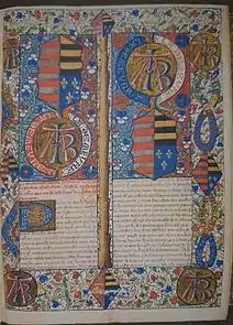 Par la suite, le couple fait de grandes acquisitions dont les manuscrits sont richement décorés. Dans ces manuscrits, le couple continue d’inscrire leurs marques de possession que sont leurs armes et leur monogramme, mais ajoute quelquefois un emblème animal : la licorne. La licorne demeure le symbole de la « force intérieure, l’illumination et la manifestation du divin. »[6], ainsi que la rose, symbole de la spiritualité et de l’amour. Cette licorne fait allusion au titre du père d’Antoine de Chourses, qui était « Seigneur de Malicorne »[7]. Cet élément peut nous faire dire que Catherine n’aurait pas participé à la collection de manuscrits du temps de son époux. D’une part, les manuscrits des débuts de la collection du couple ne reflètent pas le goût esthétique d’une femme, et d’autre part les marques de possession ne prennent pas la forme d’écus losangés, et la licorne est uniquement l’attribut d’Antoine. Dans les premiers manuscrits achetés par le couple, la licorne ne figure pas encore à côté de l’écu. En effet, les manuscrits les plus anciens datant du XIIIe siècle qui ont été achetés par le couple ne présentent pas de décors profus. Il est pour cela difficile pour les enlumineurs de disposer les armes du couple, donc, ils vont placer les armes dans les espaces vides comme dans Historia scholastica[8]. Pour figurer les armoiries, il existe des formes diverses. Les formes sont variables selon les régions, se diffusent et s’emploient dans l’ensemble de l’Europe. Les manuscrits réalisés plus tardivement et qui sont achetés ou commandés par le couple se composent de marges richement décorées dont les enlumineurs placent les armes, le monogramme et l’emblème de la licorne.