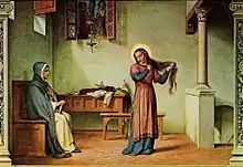 Catherine grandit et vers l'âge de treize ans, elle refuse toute coquetterie, bien qu'elle y soit poussée par sa mère. Face à ce refus, sa mère décide alors de passer par la sœur aînée de Catherine, Bonaventura, afin qu'elle développe chez la jeune fille le goût de la coquetterie[B 1]. Catherine se laisse convaincre, se farde, soigne sa toilette.