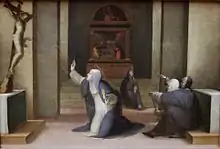 Catherine meurt à Rome, le 19[A 29] ou 29[11] avril 1380, à l'âge de trente-trois ans, après avoir subi huit jours plus tôt une forte attaque qui l'a paralysée à partir de la taille. Ses derniers mots furent : « Père, entre tes mains, je remets mon âme et mon esprit »[12]. Catherine de Sienne est morte de privations volontaires, certains voudraient ainsi la considérer comme la patronne des anorexiques[13].