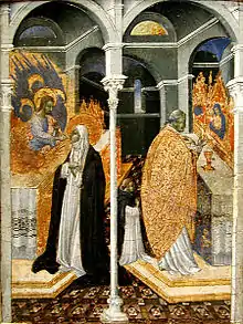 Pendant le carnaval de 1368, Catherine a une apparition qu'elle décrit comme étant son « mariage mystique avec le Christ »[B 15],[C 9],[D 1]. Au cours de la vision, le Christ lui apparaît et lui remet un anneau, signe qu'elle est son épouse[B 16]. La vision s'efface mais Catherine dit ressentir en permanence cet anneau et même le voir, et elle est la seule à l'avoir vu[B 17].