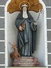 Dans l'iconographie chrétienne, elle a généralement comme attribut un cerf ou une biche, rappelant la légende de cet animal qui la défendit contre les poursuites de jeunes débauchés[5].