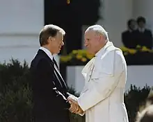 En , le pape Jean-Paul II se rend en Amérique pour son premier voyage sur sept. Il commence à Boston puis se rend à New York où il prend la parole aux Nations unies, où il plaide en faveur des droits de l’homme pour tous, en particulier pour les Arabes palestiniens. Il passe deux jours à New York où il rassemble 80 000 fidèles en célébrant la messe au Yankee Stadium, rappelant aux gens qu’il est « urgent » d’aider les pauvres. Il rencontre ensuite le président Jimmy Carter, devenant ainsi le premier pape à entrer à la Maison-Blanche. Sur la pelouse du sud, il prononce un discours devant 10 000 invités où il prône la limitation des armes nucléaires et rappelle sa position contre l’avortement[14].