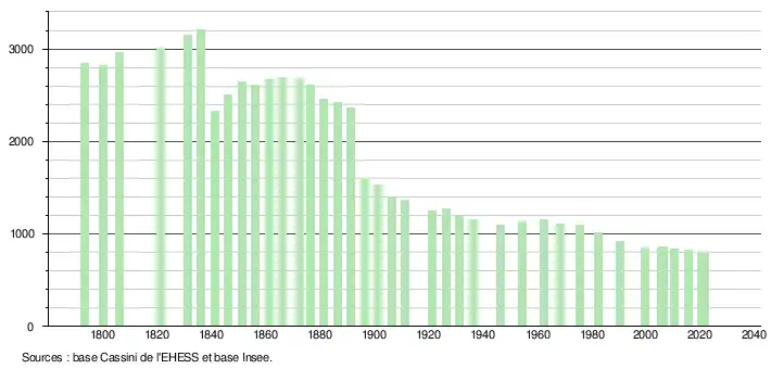 L'évolution du nombre d'habitants est connue à travers les recensements de la population effectués dans la commune depuis 1793. Pour les communes de moins de 10 000 habitants, une enquête de recensement portant sur toute la population est réalisée tous les cinq ans, les populations légales des années intermédiaires étant quant à elles estimées par interpolation ou extrapolation[25]. Pour la commune, le premier recensement exhaustif entrant dans le cadre du nouveau dispositif a été réalisé en 2005[26].
