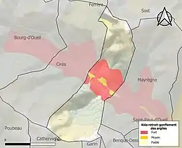 La commune est vulnérable au risque de mouvements de terrains constitué principalement du retrait-gonflement des sols argileux[28]. Cet aléa est susceptible d'engendrer des dommages importants aux bâtiments en cas d’alternance de périodes de sécheresse et de pluie. 20,5 % de la superficie communale est en aléa moyen ou fort (88,8 % au niveau départemental et 48,5 % au niveau national). Sur les 19 bâtiments dénombrés sur la commune en 2019, 19 sont en aléa moyen ou fort, soit 100 %, à comparer aux 98 % au niveau départemental et 54 % au niveau national. Une cartographie de l'exposition du territoire national au retrait gonflement des sols argileux est disponible sur le site du BRGM[29],[Carte 4].