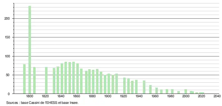 L'évolution du nombre d'habitants est connue à travers les recensements de la population effectués dans la commune depuis 1793. Pour les communes de moins de 10 000 habitants, une enquête de recensement portant sur toute la population est réalisée tous les cinq ans, les populations légales des années intermédiaires étant quant à elles estimées par interpolation ou extrapolation[33]. Pour la commune, le premier recensement exhaustif entrant dans le cadre du nouveau dispositif a été réalisé en 2008[34].