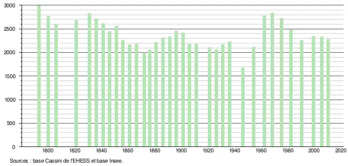 L'évolution du nombre d'habitants est connue à travers les recensements de la population effectués dans la commune depuis 1793. À partir du , les populations légales des communes sont publiées annuellement dans le cadre d'un recensement qui repose désormais sur une collecte d'information annuelle, concernant successivement tous les territoires communaux au cours d'une période de cinq ans. Pour les communes de moins de 10 000 habitants, une enquête de recensement portant sur toute la population est réalisée tous les cinq ans, les populations légales des années intermédiaires étant quant à elles estimées par interpolation ou extrapolation[25]. Pour la commune, le premier recensement exhaustif entrant dans le cadre du nouveau dispositif a été réalisé en 2005[26],[Note 1].