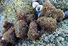 Caulacanthus ustulatus s’installe régulièrement sur les coquilles d’invertébrés marins, ici des moules.