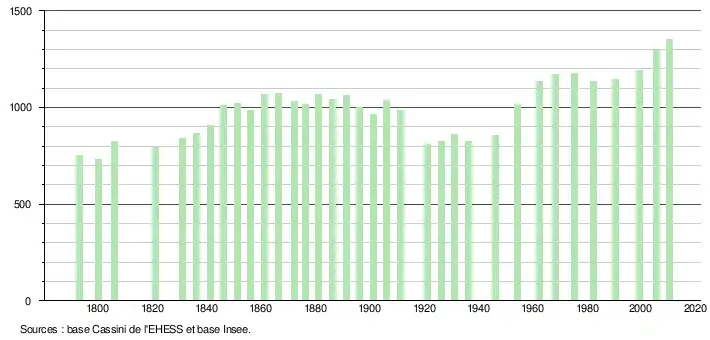 L'évolution du nombre d'habitants est connue à travers les recensements de la population effectués dans la commune depuis 1793. À partir du , les populations légales des communes sont publiées annuellement dans le cadre d'un recensement qui repose désormais sur une collecte d'information annuelle, concernant successivement tous les territoires communaux au cours d'une période de cinq ans. Pour les communes de moins de 10 000 habitants, une enquête de recensement portant sur toute la population est réalisée tous les cinq ans, les populations légales des années intermédiaires étant quant à elles estimées par interpolation ou extrapolation[10]. Pour la commune, le premier recensement exhaustif entrant dans le cadre du nouveau dispositif a été réalisé en 2005[11],[Note 2].