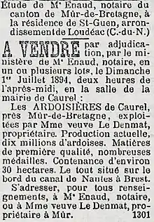 Les schistes noirs ardoisiers ((« schistes à Calymènes (en) » des auteurs anciens) datant de l'ordovicien moyen (-470 et -453 millions d’années) ont été exploités en particulier à Saint-Gelven, Caurel et Mûr-de-Bretagne[2]. En 1884 Alphonse Debauve écrit que les carrières de Saint-Gelven fournissent alors environ 5 millions d'ardoises par an et celles de Mûr-de-Bretagne et Caurel environ 3 millions[3].